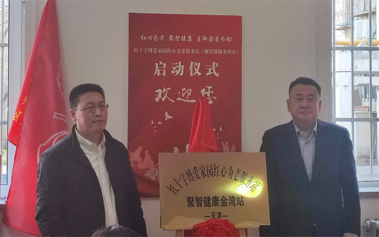 在与会嘉宾的见证下,天津市民政局养老服务处处长庞雨生与royal皇家88公益基金会秘书长叶军共同为红十字博爱家园红心为老服务站聚智健康金湾站揭牌。